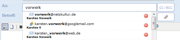 Ebenfalls völlig neu ist die Suche nach Empfängeradressen im Mailverfassenfenster. Generell sind die Treffer sortiert nach der Häufigkeit der eingehenden Mails dieser Adresse.
