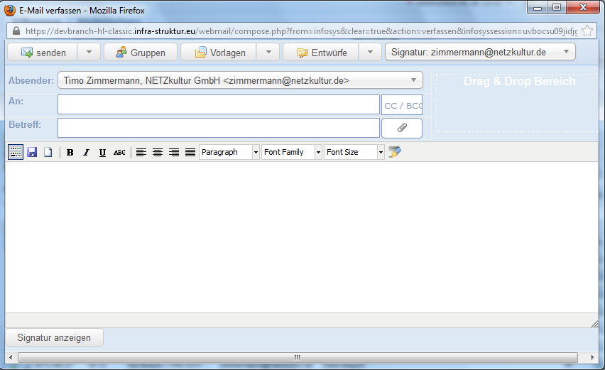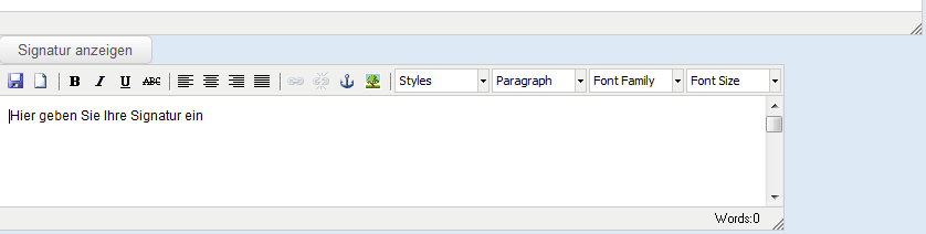 Im Textfeld können Sie über den Editor Ihre Mails nach Belieben formatieren und gestalten. Eine Schriftart und Schriftgröße, welche Sie einmal ausgewählt haben, bleibt für weitere Mails als Standardschriftart bestehen, wenn Sie diese mit dem entsprechenden Button abspeichern.