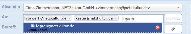 Viele Funktionen des alten Mailverfassenfensters finden sich auch in der neuen Version wieder. Entgegen der Vorgängerversion können im An-Feld jedoch nun beliebig viele E-Mailadressen nach einander gesucht und ausgewählt werden. Gleiches gilt für die cc- und bcc-Empfängerfelder, welche über den Button rechts neben dem An-Feld aktiviert werden können.